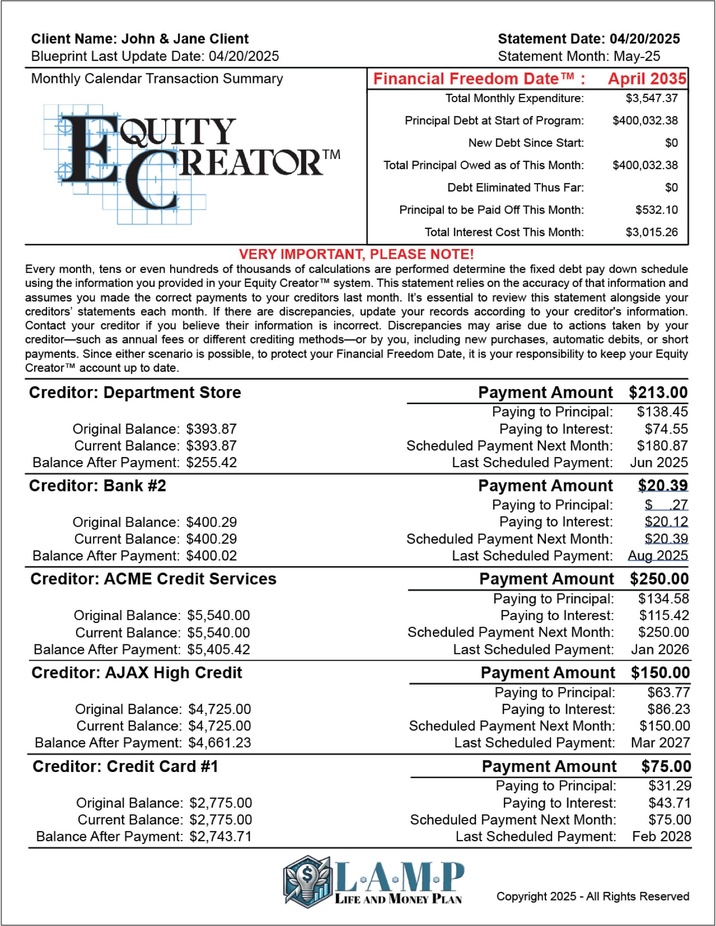 The LAMP System calculates how to eliminate debt using interest, balance, monthly payment, and duration of the debt, all automated.